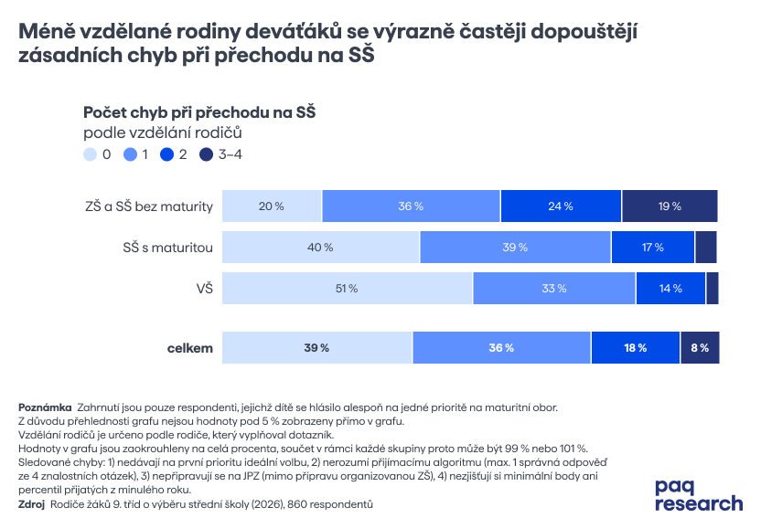 V šetření jsme zjistili, že rodiny deváťáků zásadně chybují při přechodu na střední školu. Chybují téměř dvě třetiny rodin deváťáků (62 %), přičemž u méně vzdělaných rodin dochází k výrazně více chybám. Rodiny bez maturity se dopustily dvou a více z těchto čtyř chyb téměř třikrát častěji než rodiny s vysokou školou (44 % vs. 16 %). U pětiny rodin bez maturity (19 %) je situace ještě kritičtější, jelikož se dopouštějí tří a více chyb.