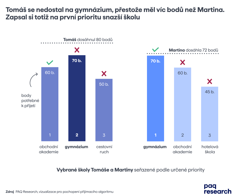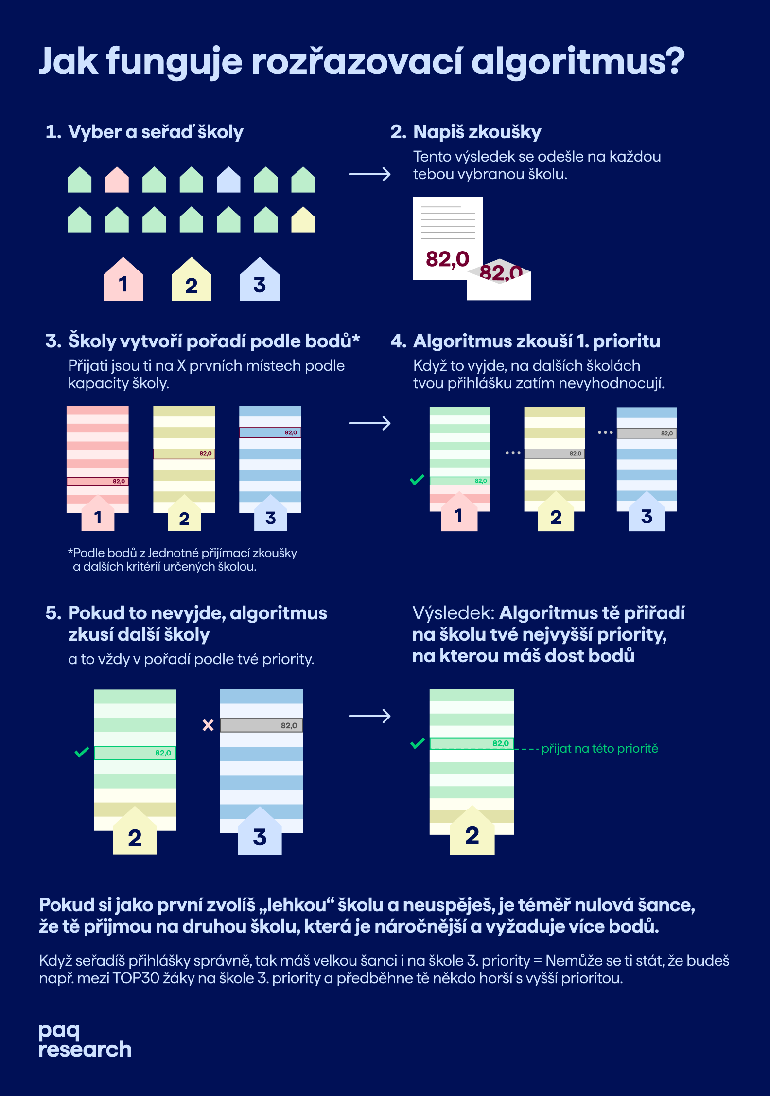- Pokud se nedostanete na svou první (vysněnou, možná i ambiciózní) volbu, nijak to nesnižuje vaši šanci na přijetí na školy na druhém nebo třetím místě. Od toho je tu algoritmus, který nejdřív ověří, na jaké školy vám stačily body a až poté vás přiřadí na školu nejvyšší priority.