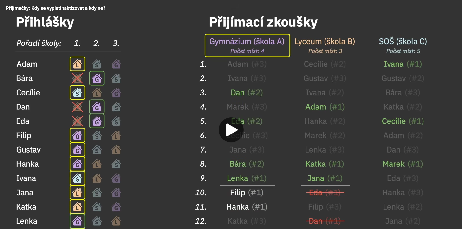 Pozor na „vcucnutí” algoritmem: Pokud dáte nejlehčí školu na první místo a dostanete se na ni (máte dostatek bodů pro umístění v pásmu pro přijetí), algoritmus vás na těžší školy už nepustí, i kdyby byly více preferované a měli jste na ně dostatek bodů.